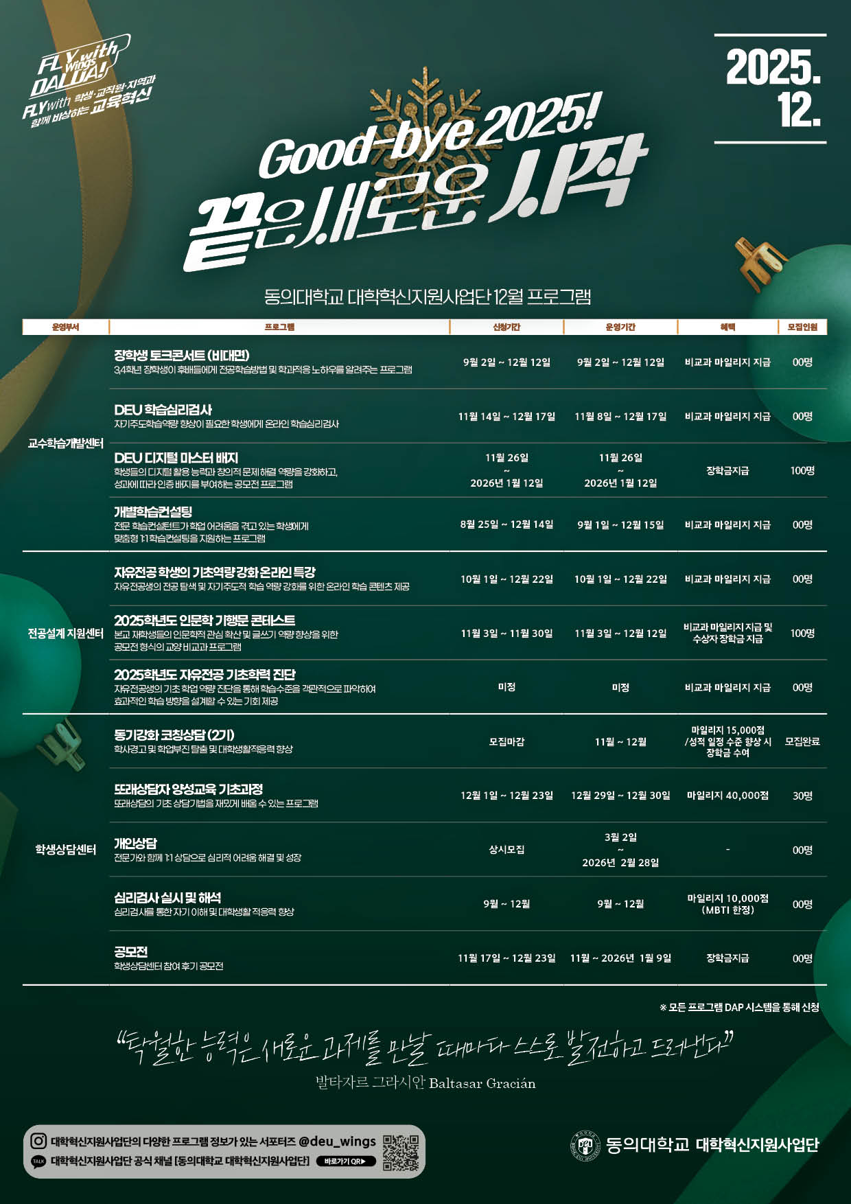1. 2025학년도 대학혁신지원사업단에서는 성과 확산 및 공유를 위한 혁신사업 참여 콘테스트를 운영하고자 이에 따른 월간 프로그램(12월) 운영 계획표를 안내드립니다.